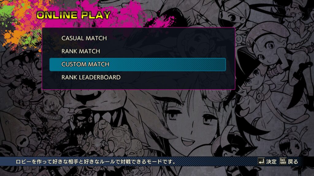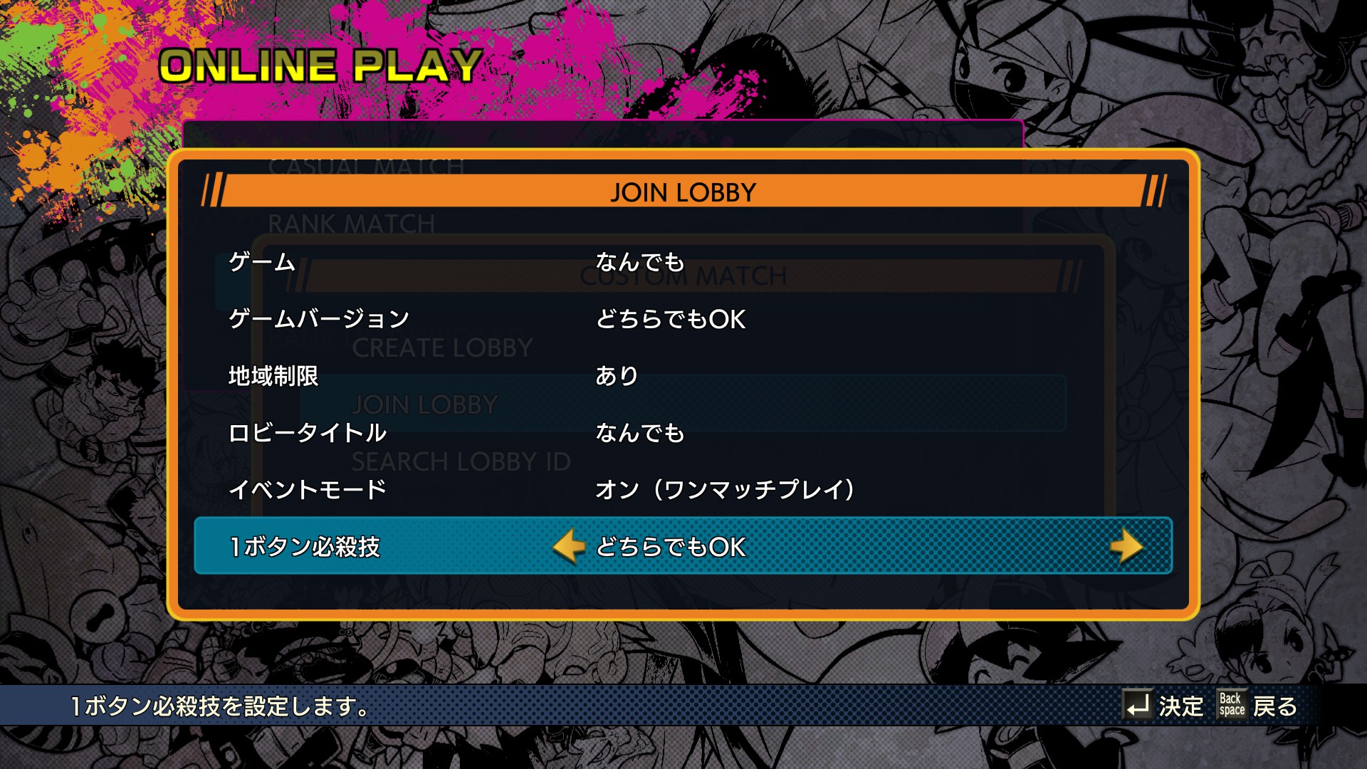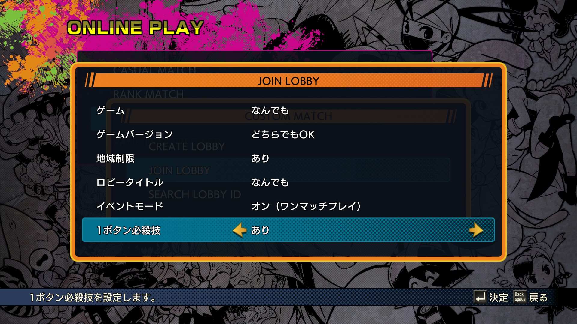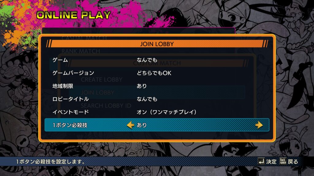 このゲームのカスタムマッチはルーム作成時に1ボタン必殺技のありなしをどちらか選べるのですが、標準設定では”あり”になっており、またこの設定は保存されません